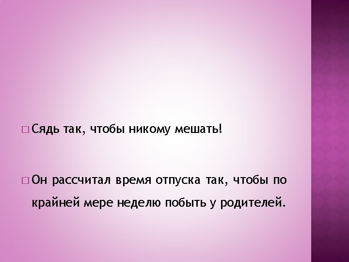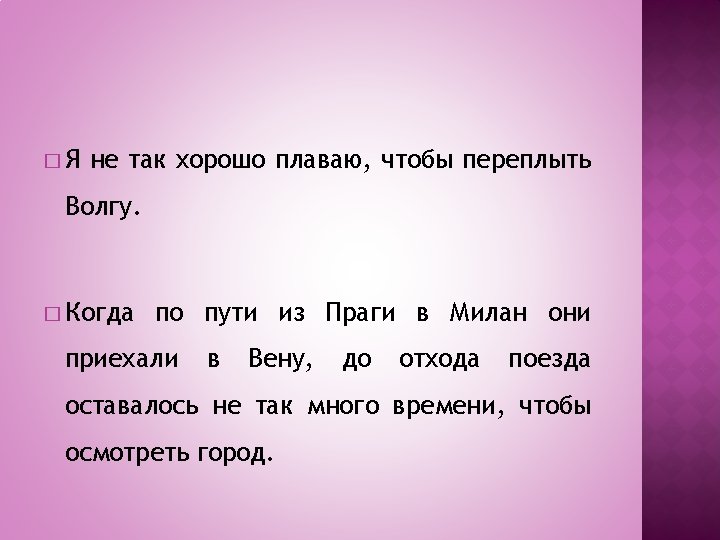 � Queste dipendenti possono essere implicite ed avere il predicato all’infinito, nel caso che il soggetto sia lo stesso della reggente. In russo l’infinito può essere retto soltanto dalla congiunzione ЧТОБЫ.