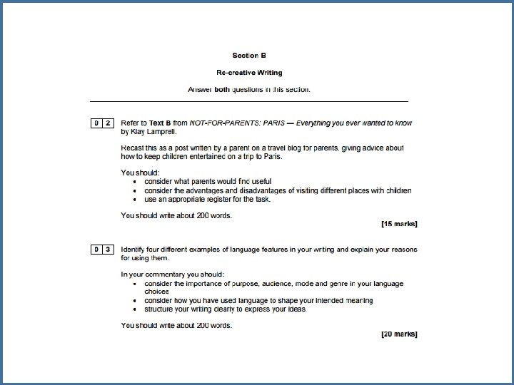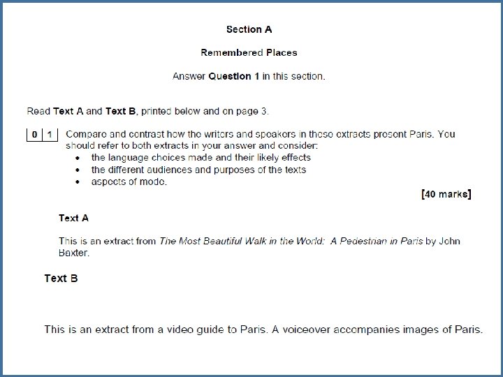 Paper 2 People and Places Section B: AS re-creative writing task Question from the specimen assessment material Refer to Text A from The Most Beautiful Walk in the World: A Pedestrian in Paris by John Baxter. Recast this as the section of the Café Danton’s website where the café’s location is described. You might consider: • what will appeal to visitors about the location • how the local area might best be described. You should write about 200 words. Slide 28