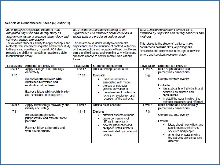 What is the examiner looking for? Look at an indicative contents on a past mark scheme AO 3: AO 1: Text A • context of tourism (Text A) • knowledge of Paris streets and culture (boulevard Saint-Germain) (Text A) • use of first person narrator and past tense to recount experience • use of third person pronouns ‘they’, ‘them’ to present the walkers as ‘others’ • use of simple/orthographic sentences for effect ‘The walkers’ • conventions of the memoir (Extract A) • likely situation of viewing and opportunity to view on a number of devices – tablet, smartphone, laptop (Extract B) • negatively-oriented lexis to describe the walkers, ‘uncertain’, ‘huddled’ • representation of tourists as out of place in Paris. Indicative Content • reasons why readers and viewers might want to read the extracts (Extracts A and B). AO 4: Text B • use of third person narrator • shifts from present to past tense to explain history • similarities and differences in likely readerships and situations of reading • similarities and differences in purpose and genres of texts (Text A: a memoir, Text B: to inform but also to persuade - both to visit France and to • use of second person pronoun to directly address the viewer buy more of the video company’s products) • instructional/invitational verb phrases – ‘take’, ‘stroll’ • ways in which Paris is made to appear attractive • lexical choices made to influence viewer and present Paris as attractive – ‘epitome of romance’, ‘each with its own personality’, ‘grand boulevards’ • distinction between own culture/society and Paris • use of well-known proper nouns related to Paris and France to give authority to video – ‘Louvre’, ‘Arc de • Paris as intriguing and worthy of narrative attention Triomphe’, ‘Napoleon’. • any other connections that are linked by narrative presentation and conventions.