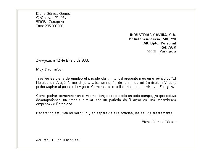 ¡OJO! • La carta debe presentarse en un folio, escrita a ordenador (salvo indicación contraria) y por una sola cara (máximo un folio Dina-4) No • Enviar siempre originales (aunque nos quedemos con fotocopias) • El papel debe ser de buena calidad, a ser posible igual que el del curriculum