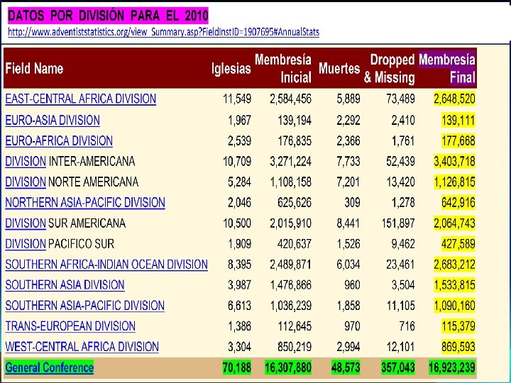 • Fundadores: Ellen White, William Miller, Joseph Bates. Fecha de creación: 23 de mayo de 1863, Battle Creek (Míchigan) Administración: Asociación General de los Adventistas del Séptimo Día Organización: Representativa por Iglesia. Oficinas: Silver Spring (Maryland, EE. UU. ) Presidente: Jan Paulsen Membresía: En 2007, según la propia Iglesia, casi 16 millones[1] Iglesias: 120. 000+ Iglesias organizadas e iglesiasmisión Pastores: 15, 813 Crecimiento: 5% por año (aprox. 1 millón de miembros nuevos por año) Países: Presencia en 201 países. (La ONU registra un total de 230 países en todo