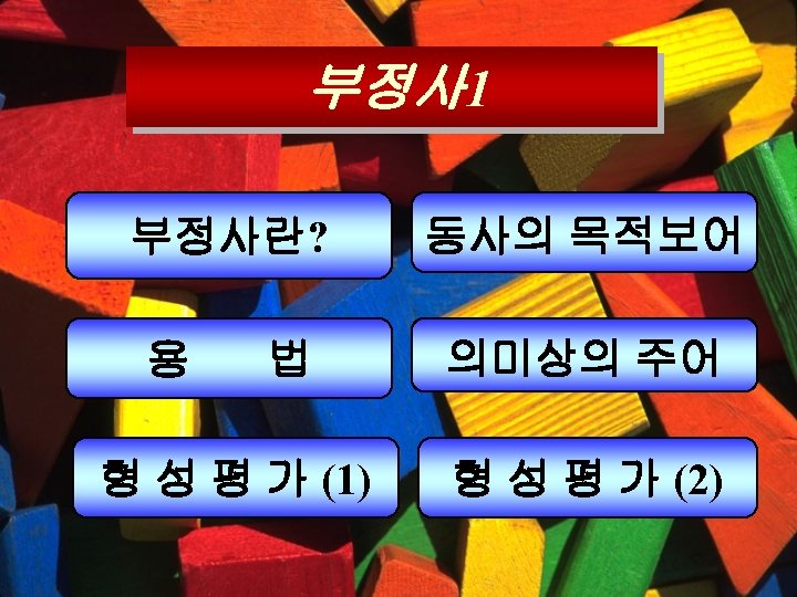 형 성 평 가 (1) Y 다음 부정사의 용법을 말하시오. 1. It is funny to watch TV. ( 명사적 ) 2. My hobby is to play tennis. ( 명사적 ) 3. I want something to drink. ( 형용사적) 4. I am glad to meet you. ( 부사적 )
