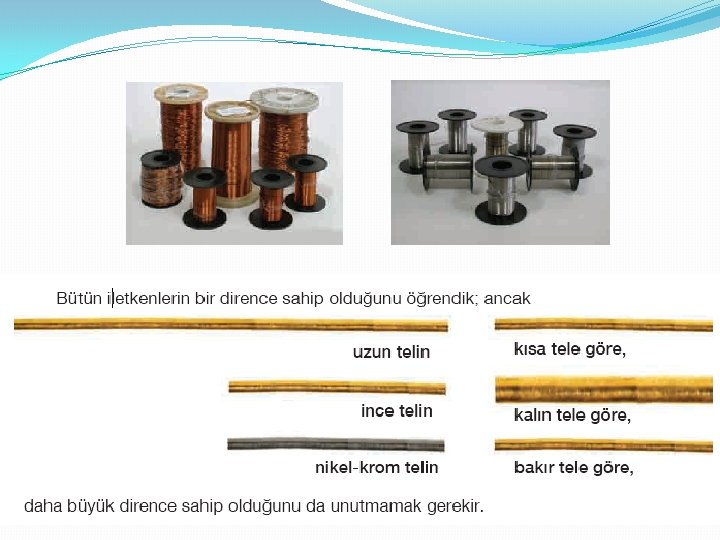 Bir madde elektrik enerjisini iletiyorsa o madde iletkendir. Ancak en iyi iletken madde bile yapısından dolayı elektrik enerjisinin iletimine karşı zorluk gösterir. Yalıtkan maddeler ise elektrik enerjisini iletmediklerinden elektrik iletimine karşı gösterdiği zorluk fazladır. Gümüş, elektrik enerjisini daha iyi ilettiği için diğerlerine göre direnci daha azdır. Cam ve teflon ise iletken olmayan yalıtkan maddelerdir. Dolayısıyla elektrik iletimine en büyük direnci iletken olmayan cam ve teflon gösterir. Yalıtkanların direnci iletkenlere göre çok daha büyüktür.