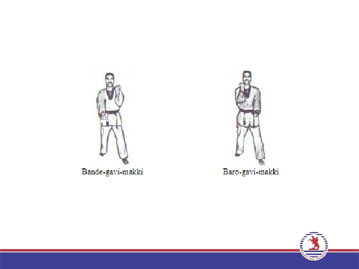 GAVİ- MAKKİ • (palmok -Are -Makki) • Çapraz olarak bir kol aşağı doğru blok ederken aynı anda orta seviyede diğer tarafa blok yapılır. (X makki) • a-Bande-gavi-makki • Yukarı seviyede blok ile ayak aynı seviyededir. • b-Baro-gavi-makki • Aşağı seviye blok ile öndeki ayak aynı hizadadır.