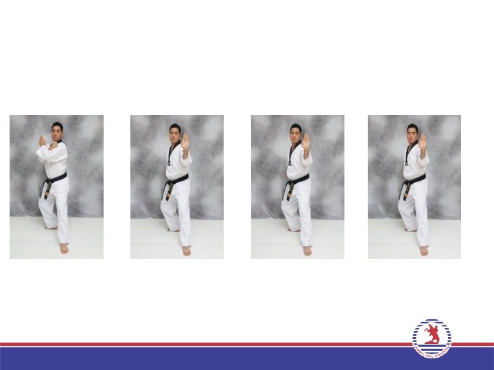 Double Knife-Hand Block: • Both hands form knife-hands as blocking hand is brought up beside the head while the rear hand is extended to the back (A), then both hands are swung forward so that the lead hand stops palm out in line with the shoulder as the rear hand stops palm up before the solar plexus (B). Blocking surface is the edge of the lead hand. This technique is a defense against direct oncoming attacks to the head and upper body with additional covering protection for the solar plexus provided by the rear hand. This technique may also be performed to protect the lower areas, as in illustrations (C, D).