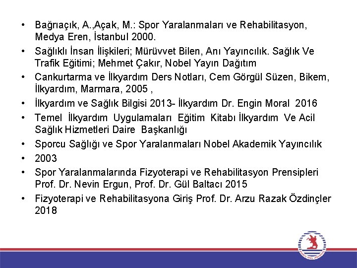 • Bağrıaçık, A. , Açak, M. : Spor Yaralanmaları ve Rehabilitasyon, Medya Eren, İstanbul 2000. • Sağlıklı İnsan İlişkileri; Mürüvvet Bilen, Anı Yayıncılık. Sağlık Ve Trafik Eğitimi; Mehmet Çakır, Nobel Yayın Dağıtım • Cankurtarma ve İlkyardım Ders Notları, Cem Görgül Süzen, Bikem, İlkyardım, Marmara, 2005 , • İlkyardım ve Sağlık Bilgisi 2013 - İlkyardım Dr. Engin Moral 2016 • Temel İlkyardım Uygulamaları Eğitim Kitabı İlkyardım Ve Acil Sağlık Hizmetleri Daire Başkanlığı • Sporcu Sağlığı ve Spor Yaralanmaları Nobel Akademik Yayıncılık • 2003 • Spor Yaralanmalarında Fizyoterapi ve Rehabilitasyon Prensipleri Prof. Dr. Nevin Ergun, Prof. Dr. Gül Baltacı 2015 • Fizyoterapi ve Rehabilitasyona Giriş Prof. Dr. Arzu Razak Özdinçler 2018
