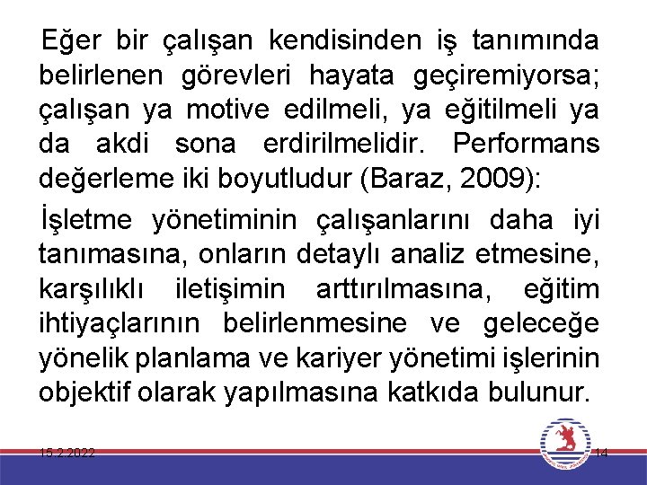 Eğer bir çalışan kendisinden iş tanımında belirlenen görevleri hayata geçiremiyorsa; çalışan ya motive edilmeli, ya eğitilmeli ya da akdi sona erdirilmelidir. Performans değerleme iki boyutludur (Baraz, 2009): İşletme yönetiminin çalışanlarını daha iyi tanımasına, onların detaylı analiz etmesine, karşılıklı iletişimin arttırılmasına, eğitim ihtiyaçlarının belirlenmesine ve geleceğe yönelik planlama ve kariyer yönetimi işlerinin objektif olarak yapılmasına katkıda bulunur. 15. 2. 2022 14