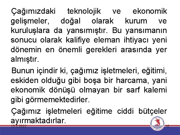 Çağımızdaki teknolojik ve ekonomik gelişmeler, doğal olarak kurum ve kuruluşlara da yansımıştır. Bu yansımanın sonucu olarak kalifiye eleman ihtiyacı yeni dönemin en önemli gerekleri arasında yer almıştır. Bunun içindir ki, çağımız işletmeleri, eğitimi, eskiden olduğu gibi boşa bir harcama, yani ekonomik dönüşü olmayan bir sarf kalemi gibi görmemektedirler. Çağımız işletmeleri eğitime ciddi bütçeler ayırmaktadırlar. 15. 2. 2022 16