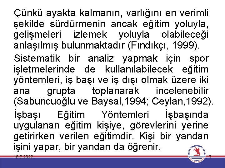 Çalışanların kendi potansiyellerinin ve eksikliklerinin farkına varmalarına, yönetimin beklentilerini daha net olarak görmelerine, işletme amaçlarını açık olarak kavramalarına yardımcı olur. Spor Tesislerinde İnsan Kaynakları Eğitimi İnsan kaynakları yönetimi uygulamalarında eğitim çok önemli bir yer kaplamaktadır. İnsanın önemi ve değerinin çağımız toplumlarının vazgeçilmez gerçeği olduğu, bilginin ise temel güç ve ana sermaye olduğu bilinmektedir. 15. 2. 2022 15