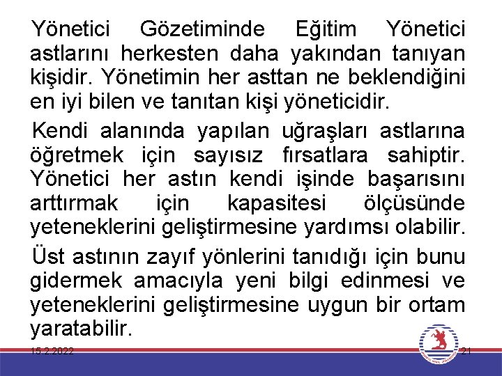 Yönetici Gözetiminde Eğitim Yönetici astlarını herkesten daha yakından tanıyan kişidir. Yönetimin her asttan ne beklendiğini en iyi bilen ve tanıtan kişi yöneticidir. Kendi alanında yapılan uğraşları astlarına öğretmek için sayısız fırsatlara sahiptir. Yönetici her astın kendi işinde başarısını arttırmak için kapasitesi ölçüsünde yeteneklerini geliştirmesine yardımsı olabilir. Üst astının zayıf yönlerini tanıdığı için bunu gidermek amacıyla yeni bilgi edinmesi ve yeteneklerini geliştirmesine uygun bir ortam yaratabilir. 15. 2. 2022 21