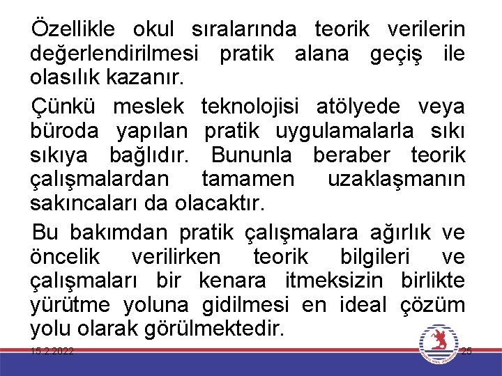 Özellikle okul sıralarında teorik verilerin değerlendirilmesi pratik alana geçiş ile olasılık kazanır. Çünkü meslek teknolojisi atölyede veya büroda yapılan pratik uygulamalarla sıkıya bağlıdır. Bununla beraber teorik çalışmalardan tamamen uzaklaşmanın sakıncaları da olacaktır. Bu bakımdan pratik çalışmalara ağırlık ve öncelik verilirken teorik bilgileri ve çalışmaları bir kenara itmeksizin birlikte yürütme yoluna gidilmesi en ideal çözüm yolu olarak görülmektedir. 15. 2. 2022 25