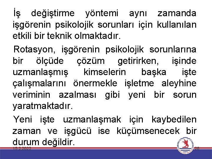 İş değiştirme yöntemi aynı zamanda işgörenin psikolojik sorunları için kullanılan etkili bir teknik olmaktadır. Rotasyon, işgörenin psikolojik sorunlarına bir ölçüde çözüm getirirken, işinde uzmanlaşmış kimselerin başka işte çalışmalarını önermekle işletme aleyhine veriminin azalması gibi yeni bir sorun yaratmaktadır. Yeni işte uzmanlaşmak için kaybedilen zaman ve işgücü ise küçümsenecek bir durum değildir. 15. 2. 2022 28