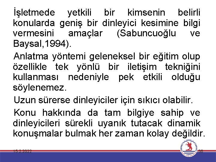 İşletmede yetkili bir kimsenin belirli konularda geniş bir dinleyici kesimine bilgi vermesini amaçlar (Sabuncuoğlu ve Baysal, 1994). Anlatma yöntemi geleneksel bir eğitim olup özellikle tek yönlü bir iletişim tekniğini kullanması nedeniyle pek etkili olduğu söylenemez. Uzun sürerse dinleyiciler için sıkıcı olabilir. Konu hakkında da tam bilgiye sahip ve dinleyicileri sürekli uyanık tutacak dinamik konuşmalar bulmak her zaman kolay değildir. 15. 2. 2022 38