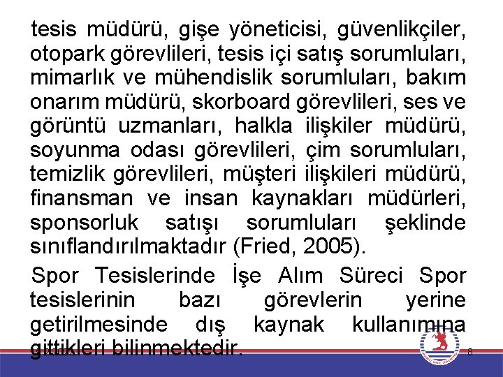 tesis müdürü, gişe yöneticisi, güvenlikçiler, otopark görevlileri, tesis içi satış sorumluları, mimarlık ve mühendislik sorumluları, bakım onarım müdürü, skorboard görevlileri, ses ve görüntü uzmanları, halkla ilişkiler müdürü, soyunma odası görevlileri, çim sorumluları, temizlik görevlileri, müşteri ilişkileri müdürü, finansman ve insan kaynakları müdürleri, sponsorluk satışı sorumluları şeklinde sınıflandırılmaktadır (Fried, 2005). Spor Tesislerinde İşe Alım Süreci Spor tesislerinin bazı görevlerin yerine getirilmesinde dış kaynak kullanımına 15. 2. 2022 8 gittikleri bilinmektedir.