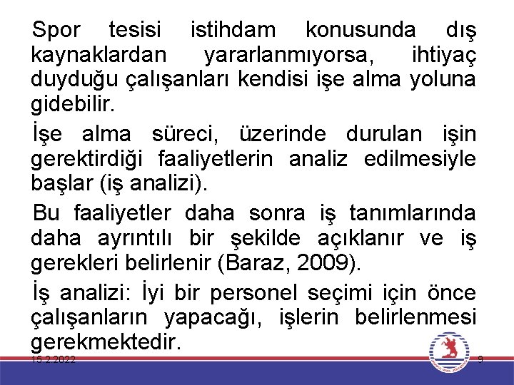 Spor tesisi istihdam konusunda dış kaynaklardan yararlanmıyorsa, ihtiyaç duyduğu çalışanları kendisi işe alma yoluna gidebilir. İşe alma süreci, üzerinde durulan işin gerektirdiği faaliyetlerin analiz edilmesiyle başlar (iş analizi). Bu faaliyetler daha sonra iş tanımlarında daha ayrıntılı bir şekilde açıklanır ve iş gerekleri belirlenir (Baraz, 2009). İş analizi: İyi bir personel seçimi için önce çalışanların yapacağı, işlerin belirlenmesi gerekmektedir. 15. 2. 2022 9