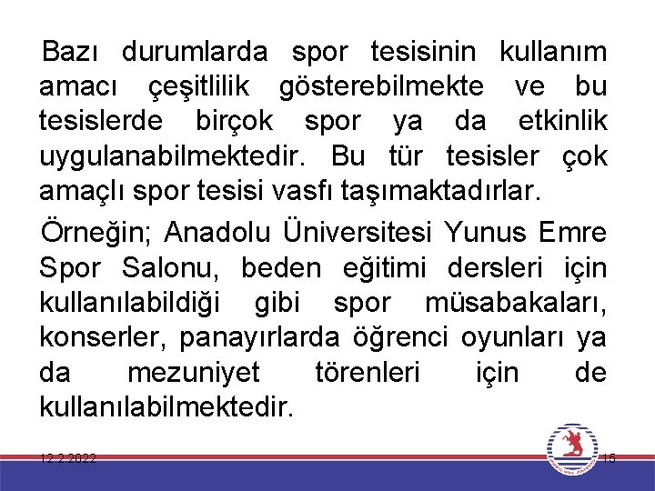 Bazı durumlarda spor tesisinin kullanım amacı çeşitlilik gösterebilmekte ve bu tesislerde birçok spor ya da etkinlik uygulanabilmektedir. Bu tür tesisler çok amaçlı spor tesisi vasfı taşımaktadırlar. Örneğin; Anadolu Üniversitesi Yunus Emre Spor Salonu, beden eğitimi dersleri için kullanılabildiği gibi spor müsabakaları, konserler, panayırlarda öğrenci oyunları ya da mezuniyet törenleri için de kullanılabilmektedir. 12. 2. 2022 15