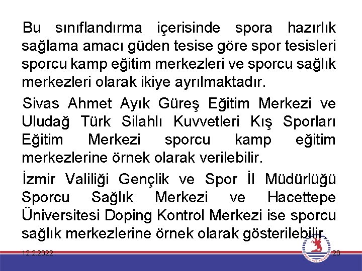 Portatif Tribün ve Soyunma Odalı Futbol Sahası Geleneksel Spor Dalları (Atlı Cirit vb. ), Yağlı ve Karakucak Güreş Alanı Okçuluk Sahası Plaj Futbolu, Hentbolü ve Voleybolu Sahası Adrenalin Sporları (Yamaç Paraşütü, Dağ Bisikleti, Rafting vb. ) Alanı Spor tesis işletmesi kavramı işletme ve spor işletmesi kavramları ile yakından ilişkilidir. Bu nedenle; öncelikle işletme ve spor işletmesi kavramlarının tanımlanması spor tesis işletmesi kavramının anlaşılmasında yarar sağlayacaktır. 12. 2. 2022 21