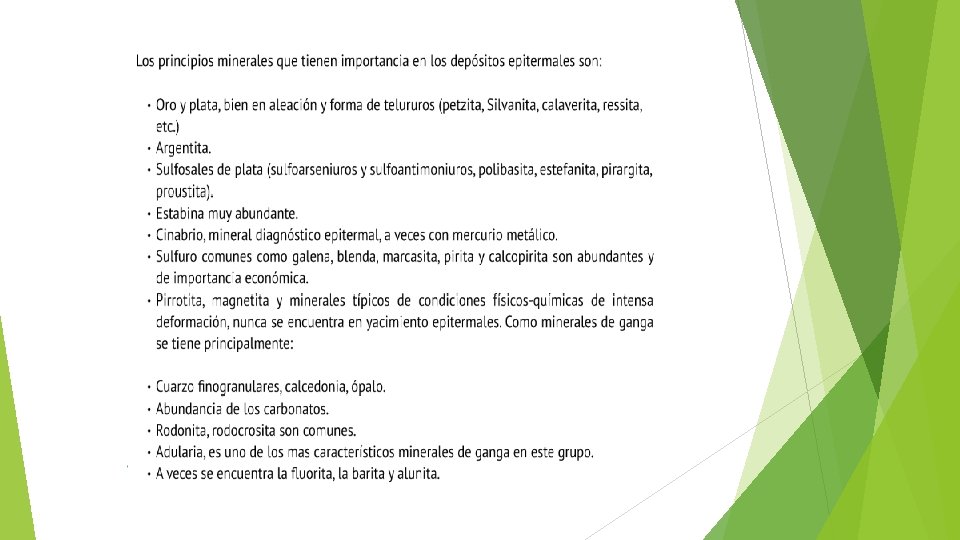 Mineralización Los depósitos minerales que se producen por este mecanismo de relleno tienen la forma del conducto y, como la mayoría de los conductos son fallas y diaclasas, las formas más comunes son las vetas (cuerpos groseramente tabulares). Están constituidas fundamentalmente por cuarzo y diversos carbonatos como calcita, dolomita y siderita, minerales que suelen constituir la ganga. Las menas que pueden estar presentes en estos yacimientos son: barita, fluorita y minerales sulfurados como la pirita, calcopirita, blenda, galena, argentita, cinabrio, entre otros.