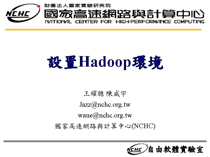 Hadoop 叢集設定與啟動 • • step 1. 設定登入免密碼 step 2. 安裝java step 3. 下載安裝Hadoop step 4. 1 設定 hadoop-env. sh – export JAVA_HOME=/usr/lib/jvm/java-6 -sun • step 4. 2 設定 hadoop-site. xml – 設定Namenode-> hdfs: //x. x. x. 1: 9000 – 設定Jobtracker -> x. x. x. 2: 9001 • step 4. 3 設定slaves 檔 • step 4. 4 將叢集內的電腦Hadoop都做一樣的配置 • step 5. 1 格式化HDFS – bin/hadoop namenode -format • step 5. 2 啟動Hadoop – node. N執行: bin/start-dfs. sh ; node. J執行: bin/start-mapred. sh • step 6. 完成!檢查運作狀態 – Job admin http: //x. x. x. 2: 50030/ HDFS http: //x. x. x. 1: 50070/