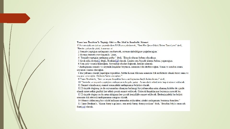 İbrahim ile Ahit: (Tekvin, 17: 1 -8) “Abram doksan dokuz yaşındaydı. Tanrı Avram’a göründü ve ona ‘Ben, Her Şeye Kâdir Tanrı’yım’ dedi. ‘Önümde yürü ve mükemmel ol. ’ Antlaşmamı seninle aramda yapacağım ve seni çok artıracağım. ’ Avram aceleyle yüz üstü yere kapandı. Tanrı ona (tekrar ve şunları) söyleyerek konuştu: ‘Bana gelince- işte seninle antlaşmam: Bir çok ulusun babası olacaksın ve artık Avram diye çağrılmayacaksın. İsmin Avraam olacak- çünkü seni bir çok milletin babası yaptım. Seni çok, ama çok verimli kılacağım ve seni uluslar hâline getireceğim - krallar senin soyundan çıkacak. Seninle ve ardından gelecek çocuklarımla aramdaki antlaşmayı, nesiller boyu, ebedi bir antlaşma olarak yerine getireceğim; hem senin Tanrı’n olacağım, hem de ardından gelecek çocuklarının. Şu anda yabancı olarak yaşadığın toprakları -Kenan ülkesini- sana ve ardından gelecek çocuklarına ebedi bir mülk olarak vereceğim ve onlara Tanrı olacağım. ”