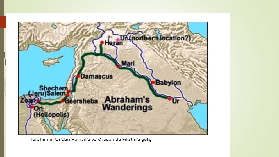 1 - ATALAR DÖNEMİ Hz. İbrahim Mezopotamya’dan Ken’an’a göç etmiştir. Hz. İbrahim geç yaşta cariyesi Hz. Hacer’den Hz. İsmail; ardından karısı Hz. Sare’den Hz. İshak doğmuştur. Tevrat’ta Tanrı’nın Hz. İbrahim ile bir ahit yaptığı, kendisini ve soyunu bereketli kıldığı, Kenan topraklarını (Filistin) mülk olarak soyuna verdiği ifade edilmektedir. Hz. İbrahim, Hz. İshak ve Hz. Yakup’tan meydana gelen üç büyük İbrani atasının ve Yakup’un on iki oğlunun hikayeleri, Hz. Yusuf’un Mısır sarayındaki yükselişi, Kenan’ da baş gösteren kuraklık yüzünden Yakup’un ve diğer oğullarının O’nun hikameyesinde Mısır’a yerleşmeleri ve burada çoğalmaları Tevrat’ın tekvin bölümünde ayrıntılı biçimde anlatılmaktadır.