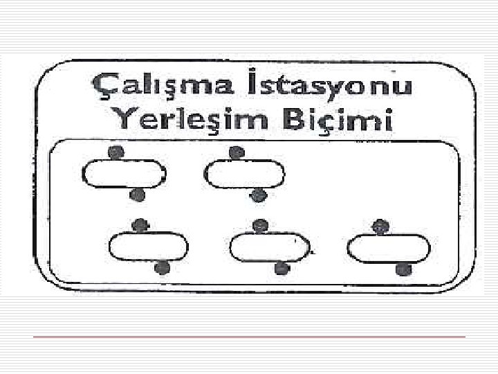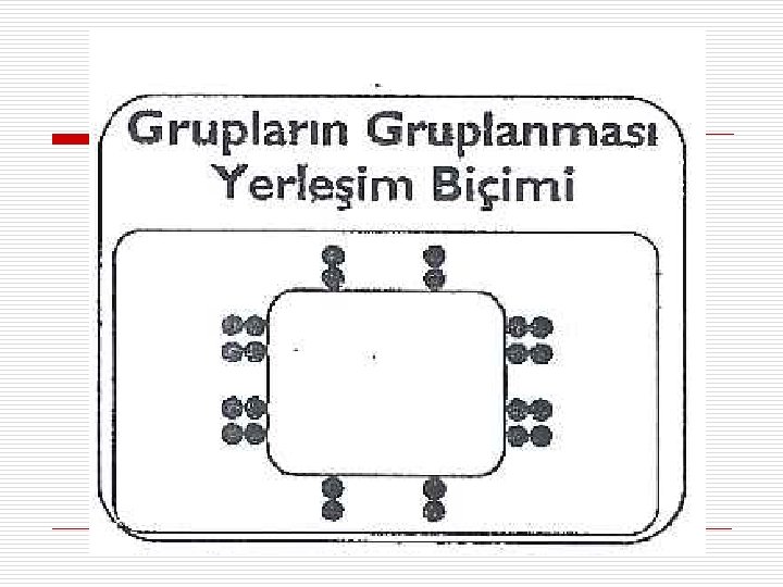 o Masaların çevresine ikişer grubun yerleştirilmesi, diğer kenarlara da grup çalışmasını gözlemleyecek grupların yerleştirilmesiyle şekillenir. o Rol yapma, münazara ya da grup çalışmalarını gözlemleme gibi etkinliklerde kullanılır.