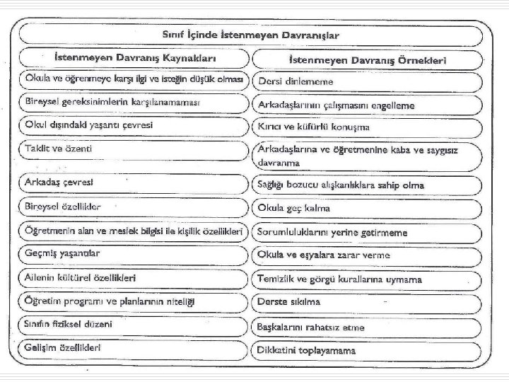 Sınıf içinde istenmeyen davranışların önlenmesi o Sınıfta istenmeyen davranışlara sebep sınıf içi ve sınıf dışı etkenler olabilir. o Sınıf içi etkenler, öğretmen, öğrenci ve fiziksel koşullar kaynaklı olabilir. o Sınıf dışı etkenler ise, aile, okul, çevre olarak gruplandırılabilinir.