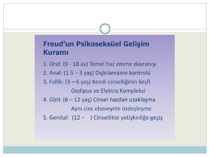 Freud’un Psiko-Seksüel Gelişim Kuramına Göre Cinsel Sağlık � Oral Dönem (0 -1. 5 yaş) � Anal Dönem (1. 5 -3 yaş) � Fallik Dönem (3 -6 yaş) � Latans/ Örtük- Gizil Dönem (6 -11 yaş) � Genital Dönem (12 -18 yaş)