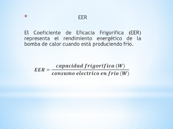 SEER Y EER *SEER (Seasonal energy efficiency ratio) la eficiencia de los aires acondicionados es medidos por el factor de energía ambiental SEER el cual representa la eficiencia del aire acondicionado Formulas para hallar el SEER :