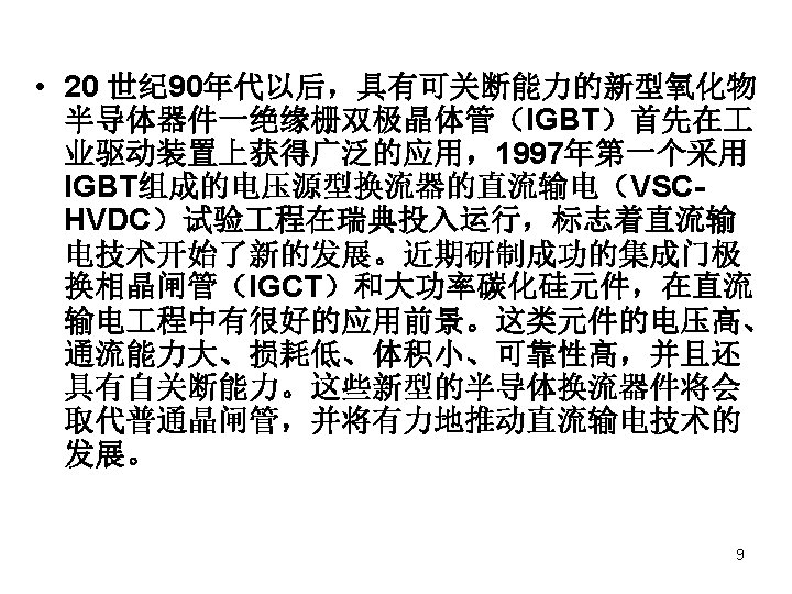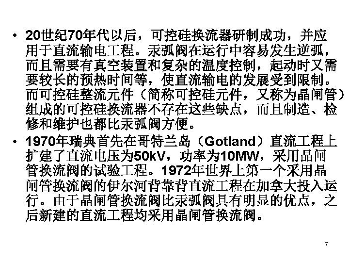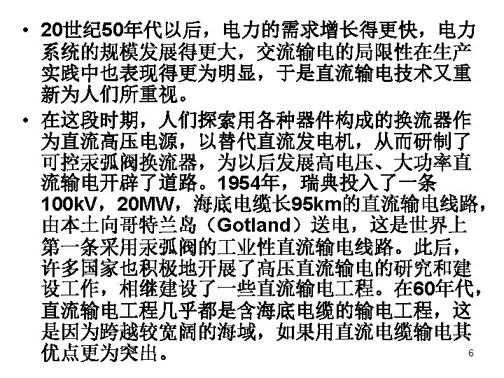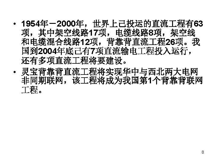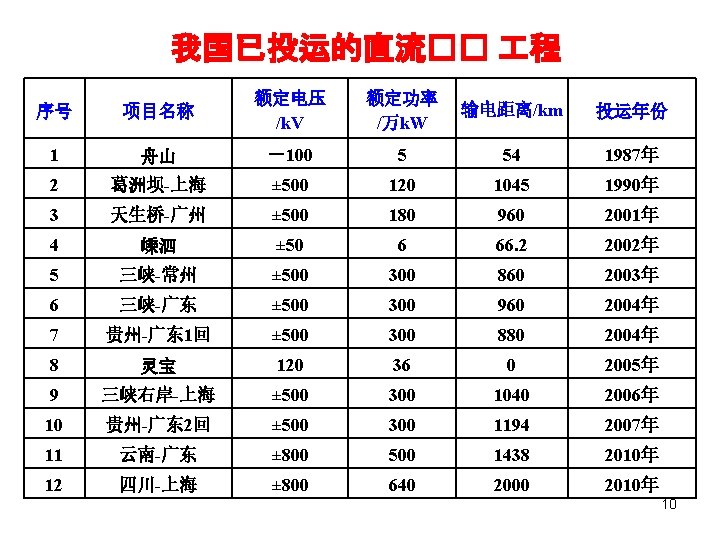Planned UHVDC before 2015 in China Projects Xiluodu –Guangdong Year Voltage(k. V) Capacity(MW) Length(km) 2012 ± 800 k. V 6400 1286 Nuozhadu -Guangdong 2012 ± 800 k. V 5000 1460 Xiluodu-Zhuzhou 2014 ± 800 k. V 6400 980 Jinping-Sunnan 2012 ± 800 k. V 7200 2095 Planned UHVDC after 2015 in China Projects Year Voltage(k. V) Capacity(MW) Length(km) Xi. Luodu-Zhexi 2016 ± 800 k. V 7200 1730 Humeng-Dezhou 2016 ± 800 k. V 7200 1600 Hami-Zhenzhou 2020 ± 800 k. V 7200 2400 Zhundong-Yubei 2020 ± 800 k. V 7200 2800 Longpan-Guangdong 2020 ± 800 k. V 6400 28