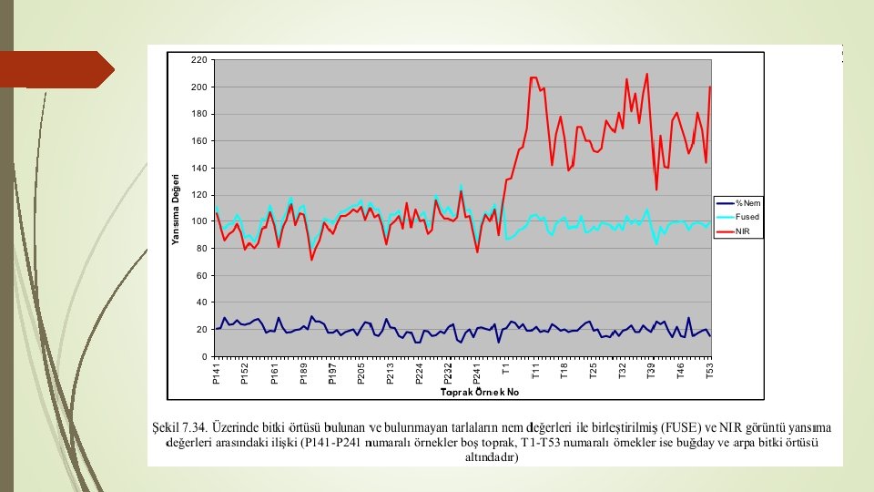 Sonuçta, boş topraklı test noktalarında, 3. bant ve birleştirilmiş görüntü yansıma değerlerinin toprak nemine karşı davranışlarının benzer olduğu, yansıma şiddetinin artan nem oranına ters orantılı olarak azaldığı saptanmıştır. Ancak bu ilişki toprak yüzeyinde bitki örtüsünün bulunduğu bölgelerde benzerliğini yitirmektedir (Şekil 7. 34). NIR enerjinin bitki örtüsü olduğu bölgelerde nemden bağımsız olarak ve şiddetle artmasına karşın, birleştirilmiş görüntüde yansımanın bitki örtüsünden etkilenmediği ve toprak nemine uyumlu olarak, önemli bir sapma göstermeden algılanabildiği belirlenmiştir.