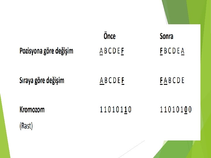 Mutasyon Kromozomların kendi genleri veya genleri oluşturan küçük birimleri üzerinde değişiklik yapılmasını sağlayan işlemcidir. GA’da değişimin sağladığı avantaj, problemin çözüm alanını araştırmada yön değişikliklerini sağlayarak ‘Mutasyon(Değişim) yardımıyla araştırmanın kısır döngüye girmesini önlemektir. ‘(Lokal. Maksimum) Pozisyonagöredeğişim: Rasgele seçilen karakterlerin(genlerin) yerleri değiştirilerek gerçekleştirilir. Sıraya göre değişim: Kromozomun rasgele seçilen iki karakterinden ikincisinin, birincinin önüne getirilmesiyle olur.