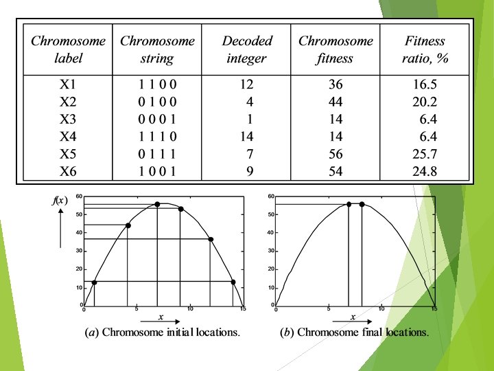 GA (Example) A simple example will help us to understand how a GA works. Let us find the maximum value of the function (15 x x 2) where parameter x varies between 0 and 15. (integer values with four gens. Suppose that the size of the chromosome population N is 6, the crossover probability pc equals 0. 7, and the mutation probability pm equals 0. 001. The fitness function in our example is defined by f(x) = 15 x x 2 Artificial Intelligence A Guide to Intelligent Systems