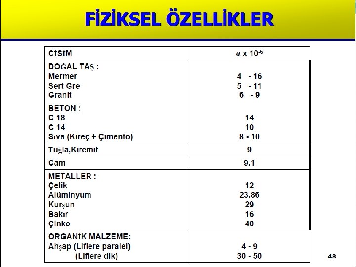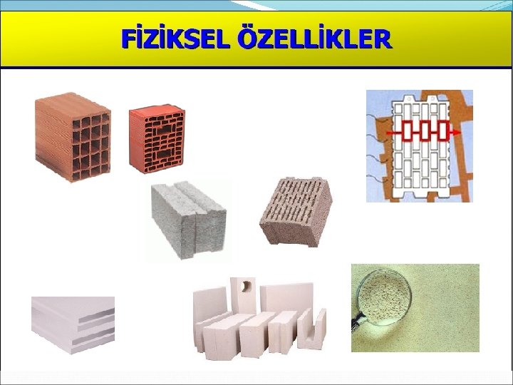Fiziksel özellikler § § § § § Birim Ağırlık, Özgül Ağırlık, Porozite, Kompasite (doluluk), Su Emme, Doyma Derecesi, Geçirimlilik, Rötre ve Şişme, Kapilarite (Kılcal Su Emme).