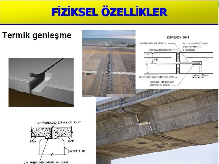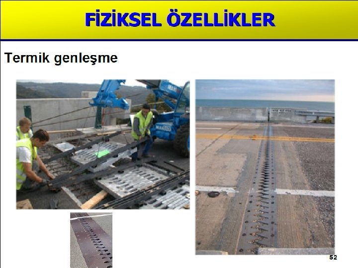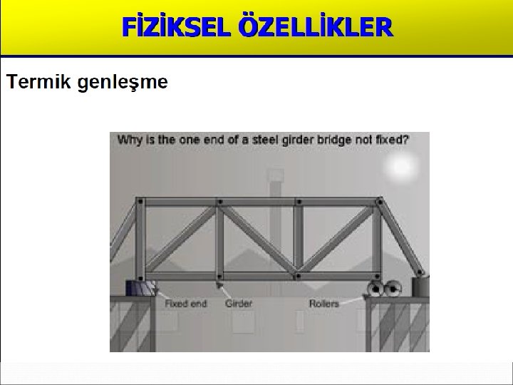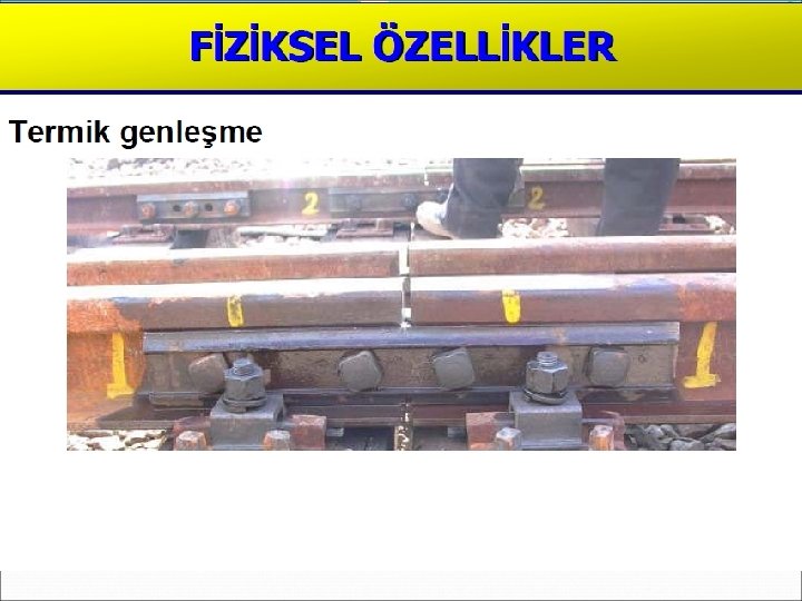 Termik Özellikler Genleşme Katsayısı Bir cismin sıcaklığının 1 C artması halinde birim boyunda meydana gelen artmaya genleşme katsayısı denir ve ile gösterilir. Bir çubuğun boyu ilk boyu (L 0), ( t) sıcaklık artışı halindeki boy uzaması ( L) ise bu; L=. L 0. t formülü ile ifade edilir. Yeni boy ise (L= L 0 + L) şeklinde belirlenir.
