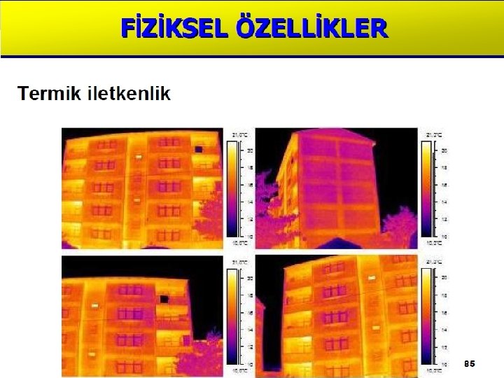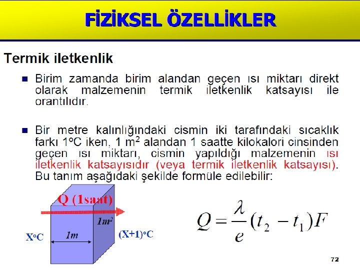 Termik Özellikler Isı iletkenlik katsayısı Bir malzemenin iki tarafında farklı bir sıcaklık var ise sıcaklığın yüksek olduğu taraftan az olan tarafa doğru bir sıcaklık akımı (difüzyon) meydana gelir. Birim zaman ve birim alanda malzeme içinden geçen ısı miktarı, ısı iletkenlik katsayısı ile orantılıdır. Aşağıdaki şekilde lamda ( ) ısı iletkenlik katsayısı, alanı 1 m 2 , kalınlığı 1 m. olan tabakanın iki tarafı arsındaki ısı farkı 10 °C iken 1 saatte geçen ısı miktarıdır.