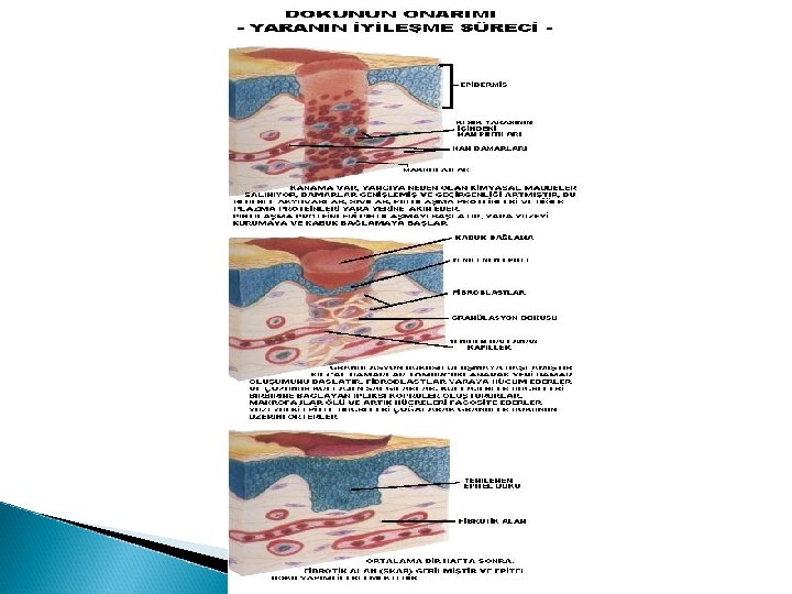 YARA İYİLEŞMESİ 1. Kanamanın durdurulması dönemi Hemostaz • İlk anlarda başlayan vazokonstriksiyon 10 dakika kadar devam eder • Pıhtılaşma oluşur. 2. Yangı dönemi-Inflamatuar faz • Yara yerine granülositler ve makrofajlar yığılır • Histamin salgılanır 3. Epitel oluşma dönemi-Epitelizasyon fazı • 12 saatte oluşur, yeni deri katmanlarının oluşmasıyla iyileşme süreci tamamlanır
