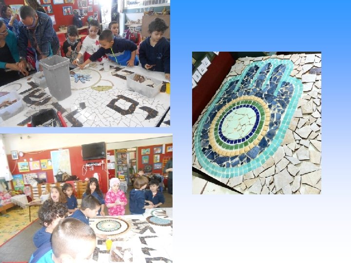 The mosaic has cultural elements and it expresses the idea of friendship between Yasmin and Julis children לפסיפס אלמנטים תרבותיים והוא מבטא את רעיון הידידות בין ילדי גן יסמין והגן בגוליס
