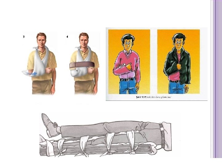 İlk yardım: • • Hayatı tehdit eden yaralanmalara öncelik verilir, H/Y hareket ettirilmez, sıcak tutulur, Kol etkilenmişse ödem gelişebileceği için takıları çıkartılır, Tespit ve sargı yapılırken parmak uçları görünecek şekilde açıkta bırakılır (Parmaklardaki renk, ısı ve duyarlılık kontrol edilir. ), Kırık bölge üstündeki ve altındaki eklemleri de içine alacak şekilde sabitlenir ve hareketsizliği sağlanır, Kol ve bacaklar istirahate alınır, Tıbbi yardım istenir (112).