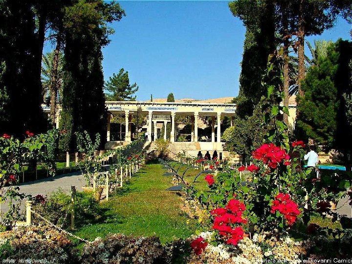SHIRAZ • Shiraz est une ville située dans le sudouest de l'Iran, capitale de la province de Fars. Est situé à 1. 486 m au dessus du niveau moyen de la mer au pied des monts Zagros, avec une population de 1. 255. 955 (2005). Shiraz est la capitale de la Perse pendant la dynastie Zand, entre 1750 et 1794. Elle est connue comme la ville de la poésie, du vin, des roses et des lucioles