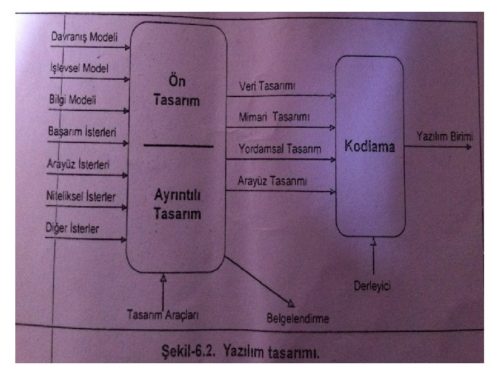 q Öntasarım(preliminarydesign): İsterlerin mimari ve veri tasarımına dönüştürülmesidir q Ayrıntılı tasarım(detail design): Mimari ve veri tasarımın ayrıntılı veri yapıları ile algoritmik gösterime dönüştürülmesine denir. Her iki aşamanın sonunda resmi gözden geçirme işlemi yapılır. Pek çok projeden bu aşamalar ödemeye esas önemli geçiş noktalarıdır. Yazılım tasarımı, isterler çözümlenmesi sonunda elde edilen bilgiler yazılım tasarımı ile gerçekleşir. Ve kodlamaya esas olacak mimari tasarım veri tasarımı, ara yüz tasarımı ve yordamsal tasarımı yapılır. Bu arada gerekli belgeler üretilir.