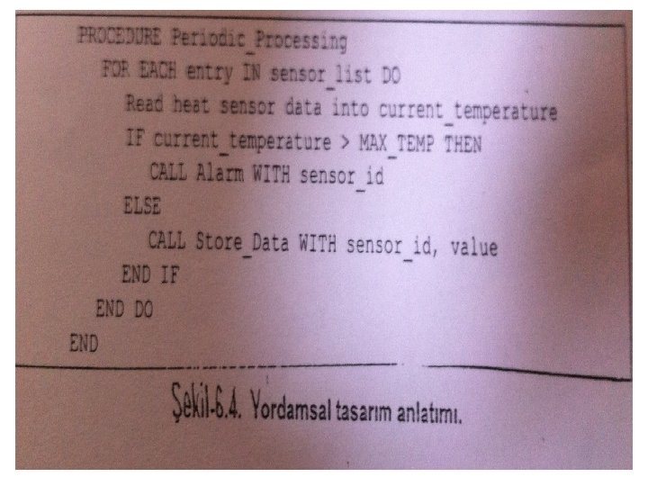 Tasarım konuşma diline yakın anlatımla yapılabileceği gibi çeşitli şekilsel gösterimlerle de yapılabilir. Şimdi yordamsal tasarımın nasıl yapılacağını görelim. YAPISAL PROGRAMLAMA GÖSTERİMİ Yazılım tarihinin en eski tasarım yöntemlerinden biri işlevleri metinsel bir biçimde anlatmaktır. Bu anlatım için özellikle ingilizce kullanılmaktadır. Program tasarım dili(Programming Design Language)adı verilen bir dilde tasarım için tanımlanmıştır. Sözde kod(pseudo) adı verilen bu yöntemle , gerçek programlama dili yapılarına aynı şekilde , ancak daha serbest bir söz dizimiyle her yapı ve her yordam tanımlanır. Özellikle ardışık deyimler, koşullu dallanma ve döngüler kullanılır.
