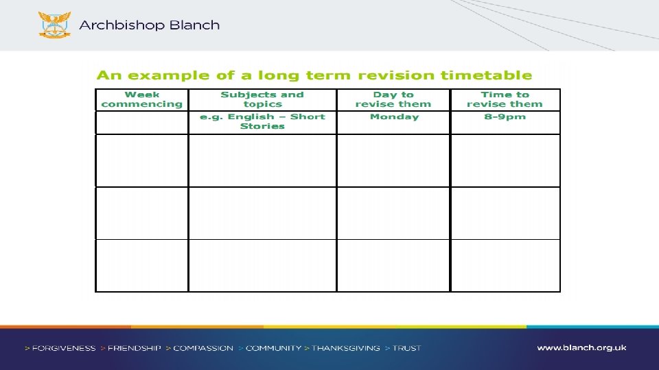 Organisation • Start revision early. The sooner you start the less you will have to do each day and the less stressed out you will be • The most important thing is to make a realistic revision timetable that you will stick to • Get one good revision book or aid for every subject. They do much of the initial work for you by breaking the subject down into ‘do-able’ chunks