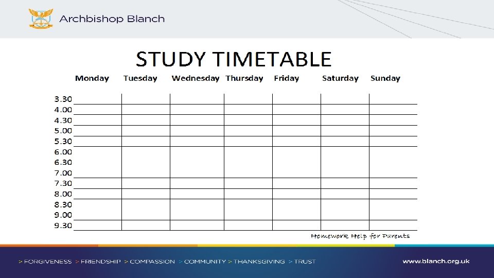 Keeping it in perspective • If they are finding it difficult… - remind them that it’s hard for everyone - tell them it will soon be over - it will be worth the effort and sacrifice in the long run. • If they think they have ‘failed’ an exam, reassure them they probably haven’t • If they are stuck, get them to ask for help • They can only do their best! • Contact us if you are worried that they seem overwhelmed.