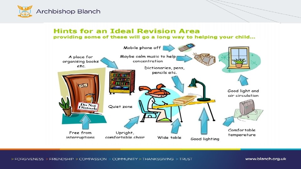 Working environment • Find somewhere quiet to revise – your bedroom and refuse to be interrupted and distracted. • Don’t revise in front of the television, or while listening to the radio. • Sit at a proper table or desk if you can. Bed isn’t a great place to revise as snoozing is far too tempting.