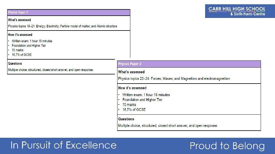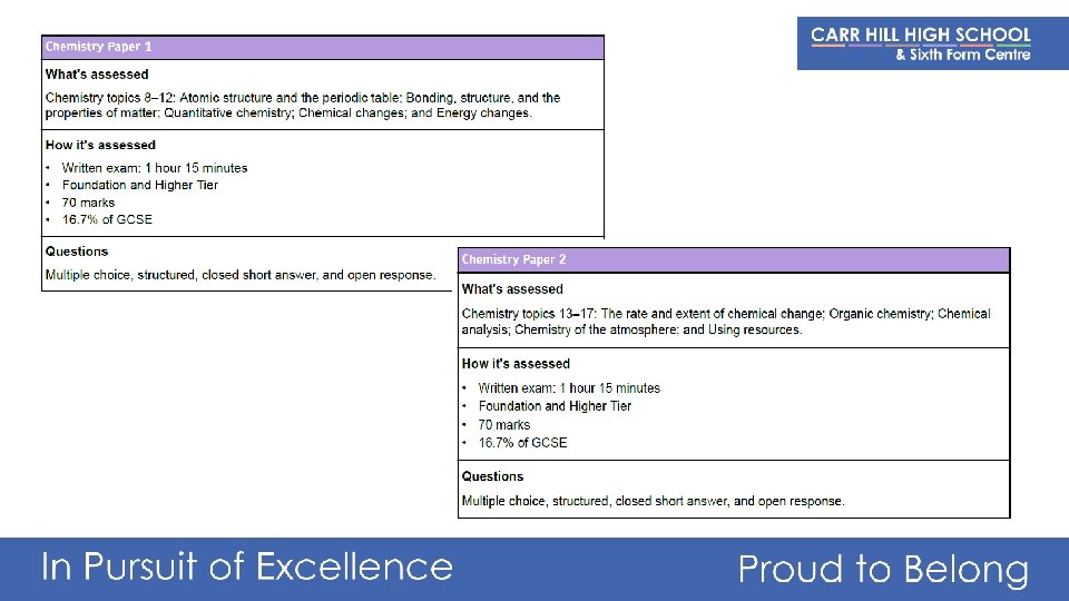 Higher or Foundation? • We use AQA exam board. • The content in the foundation paper is easier. • Grades available in a foundation paper are now the equivalent of a grade B and below (Grades 1 to 5). • Grades available in a higher paper are equivalent of a grade C and above (4 to 9). • For both papers if you fall below the minimum grade it is a fail. • The structure of the assessments is identical for both. • The students are regularly assessed and will be put on the most appropriate tier to help maximise their performance.