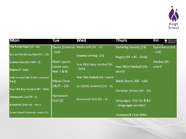 Extra-Curricular • Programme runs Monday-Friday from the second week of each term, through to, and including, the penultimate week • Some clubs are free of charge to parents • Some clubs are offered at cost price to parents • Students are encouraged to sign up for at least one club per week but many do more