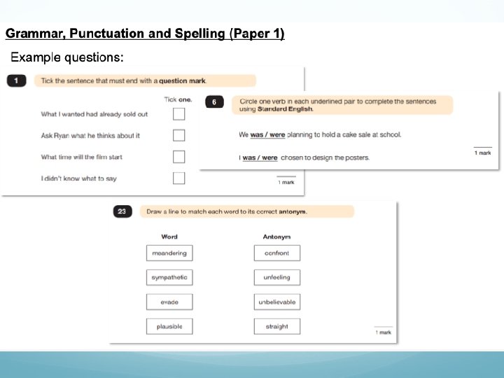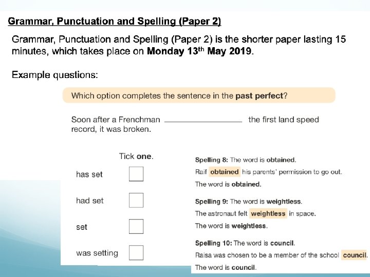 Grammar, Punctuation and Spelling is made up of two papers which will take place on Monday 13 th May 2019: • Paper 1 is the longer paper lasting 45 minutes, children will be tested on grammar, punctuation and spelling generally; • Paper 2 is a shorter paper lasting 15 minutes, where children will be tested on spelling only – they are asked to fill in a blank within a sentence, attempting to spell out the spelling word in context correctly.