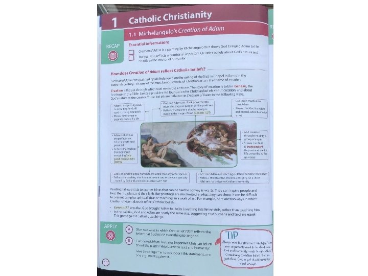 By the end of this unit you will know and understand: • Michelangelo’s creation of Adam. • How Michelangelo’s Creation of Adam demonstrates ‘Who God is’. • The account of Creation in Genesis 1 and 2. • The Omni-qualities of God from Genesis 1 and 2. • The origins of the Bible. • The Catholic and other Christian interpretations of scripture. • How the goodness of Creation leads to Catholic understanding of Natural Law. • The Magisterium and how it influences Catholic views of the harmony between science and religion. • How Natural Law influences Catholic beliefs about the Sanctity of Life. • The Catholic teachings about creation and the environment and how they influence Catholics to care for the environment. • The importance of sustainability to Catholics and how Catholic teachings influence the work of • CAFOD on Sustainability.