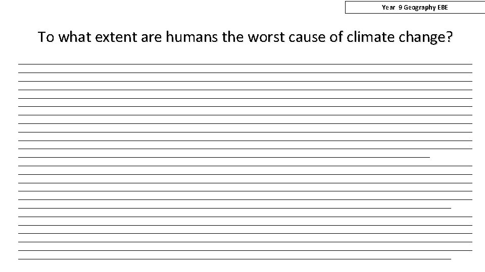 Explain how each of the following enhance the greenhouse effect. Causes of Climate Change Burning Fossil Fuels _________________________________________________________________ _________________________________________________________________ Agriculture Deforestation _________________________________________________________________ _________________________________________________________________ _________________________________________________________________ _________________________________________________________________ Year 9 Geography EBE Work Bank Carbon Dioxide Greenhouse Gases Farming Deforestation Cattle Methane Greenhouse Effect Machinery Atmosphere Factories Challenge – Which of these causes do you think is the worst? Explain your answer. ____________________________________ ____________________________________ ____________________________________
